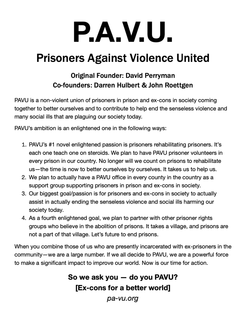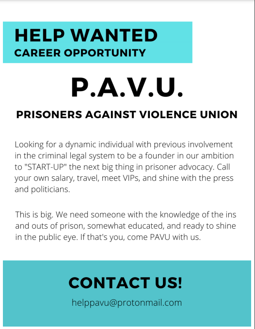 PAVU industries will be a major business corporation ran by prisoners and ex-prisoners to make a major positive difference in our community, in our country, and in our world. We will do what other prisoners rights organizations wont do, and that’s to assist with personal and all other matters. Why wouldn’t we do that? It’s us helping us.